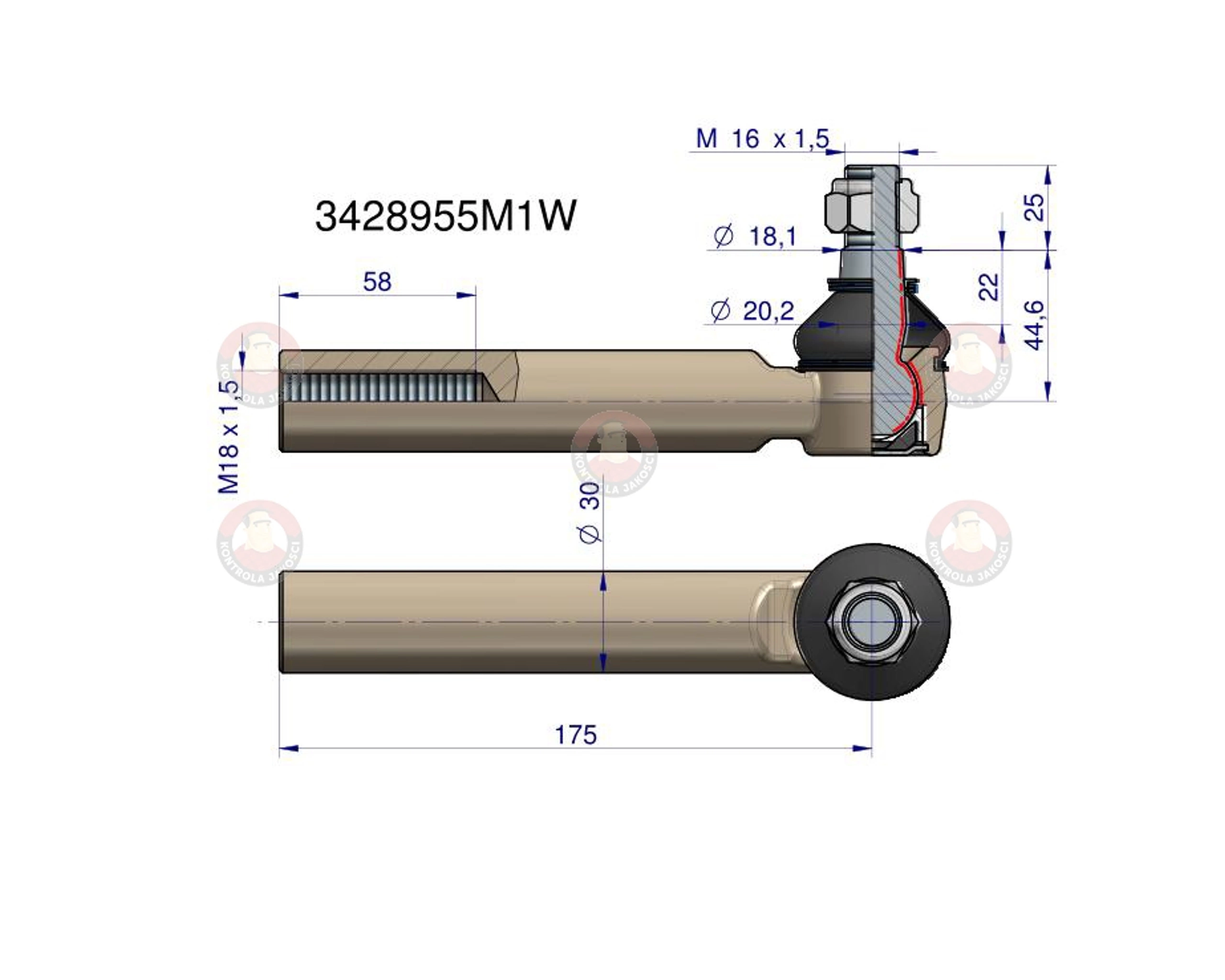 Przegub kierowniczy 185mm M18x1.5 3428955M1 Massey Ferguson. Landini WARYŃSKI