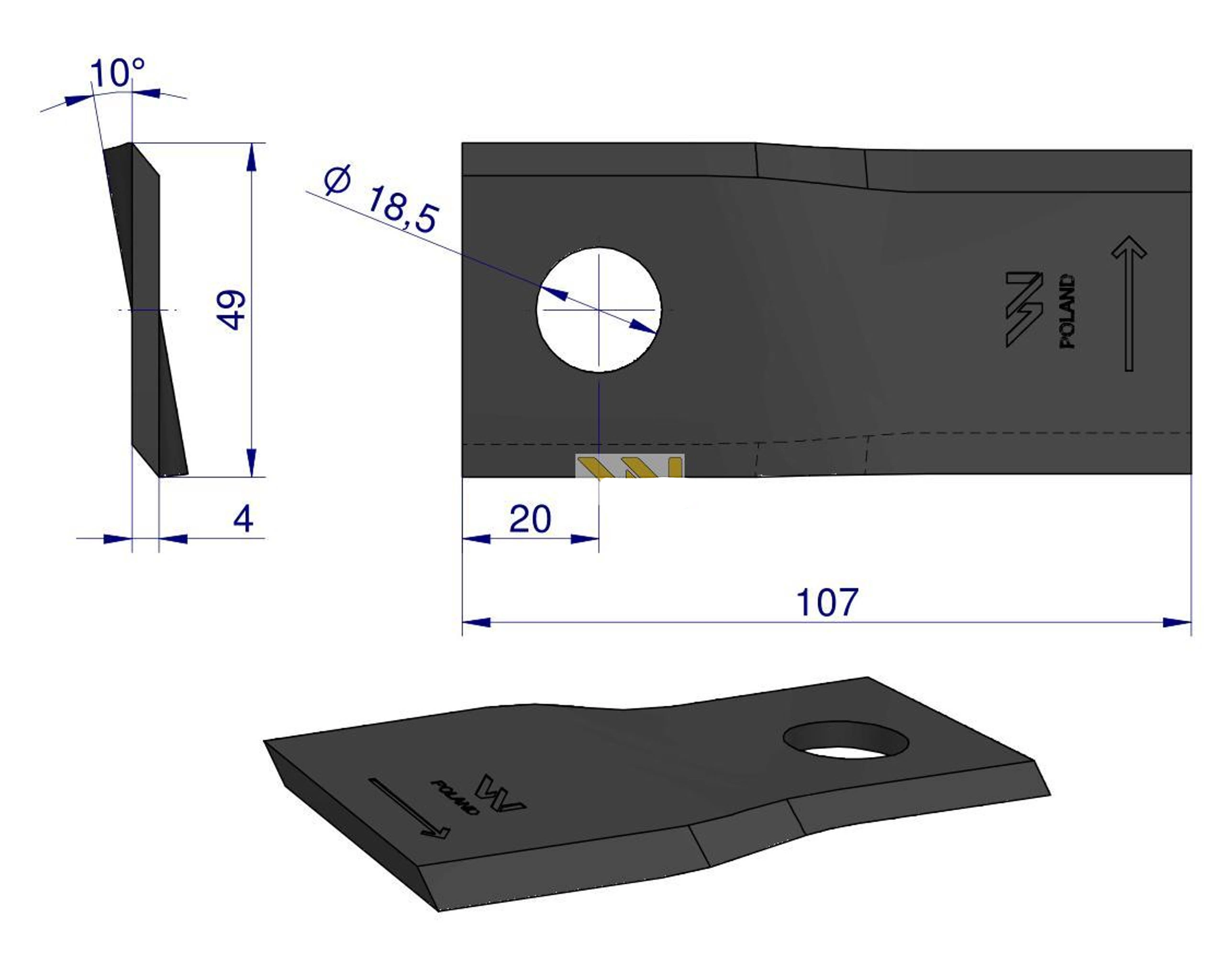 Nóż nożyk kosiarki lewy 107x48x4mm otwór 18.5 Vicon 90261559 WARYŃSKI