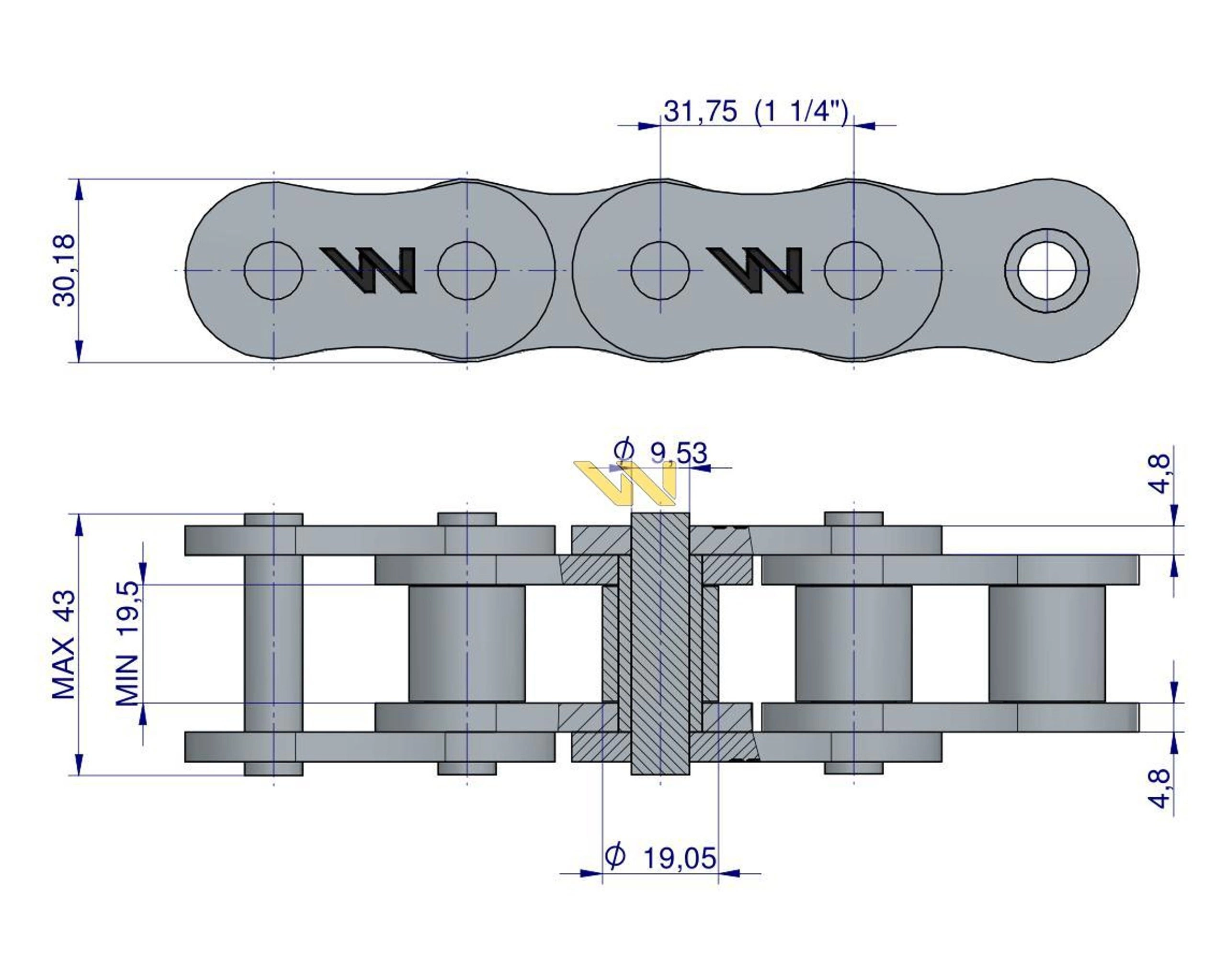 Standard Brytyjski wykonane według normy: PN77/M-84168, DIN 8187,ISO 606, BS228. Monitorowany proces hartowania sprawia, że łańcuchy firmy Waryński posiadają zwiększoną odporność na ścieranie. Proces ten odbywa się pod specjalnym nadzorem przy idealnie zachowanych parametrach pieca oraz cieczy chłodzącej. Nasze łańcuchy cechuje ponadto zwiększona wytrzymałość na rozciąganie dzięki pasowaniu sworzni z płytkami z dokładnością do mikrona oraz zwiększona odporność na zrywanie poprzez zakuwanie sworzni z odpowiednią, powtarzalną siłą. W naszych produktach idealnie zachowana jest odległość pomiędzy sworzniami, łańcuchy rolkowe Waryński perfekcyjnie współpracują z kołami zębatymi. Pamiętaj, aby stosować koła pewnych i sprawdzonych producentów. Masz dosyć rozciągających lub zrywających się łańcuchów rolkowych? Poznaj najmocniejsze ogniwo! Łańcuchy rolkowe firmy Waryński to: - zwiększona odporność na ścieranie (Hartowanie sprawia, że łańcuchy Waryński są mocniejsze i mają dłuższą żywotność. Proces ten odbywa się pod specjalnym nadzorem, dzięki czemu zapewnione są idealne paramenty pieca oraz cieczy chłodzącej.), - wytrzymałość na rozciąganie (To zasługa pasowania sworzni z płytkami, z dokładnością do mikrona. Dzięki temu łańcuch działa sprawnie – ogniwa nie wybijają się oraz nie powstają luzy. Dokładne szlifowanie elementów walcowych łańcucha zabezpiecza go przed ugniataniem i ścieraniem się elementów walcowych.), - zwiększona odporność na zrywanie (Wszystkie sworznie zakuwane z odpowiednią, powtarzalną siłą. Zbyt mocne zakucie może mieć wpływ na uszkodzenie innych elementów składowych łańcucha, zbyt słabe natomiast, może spowodować zerwanie łańcucha. Powtarzalna siła zakuwania, dzięki zautomatyzowanemu procesowi gwarantuje, że każde ogniwo łańcucha jest identyczne, perfekcyjne.), - idealna współpraca z kołami (Dokładne i powtarzalne odległości pomiędzy sworzniami powodują, że łańcuch idealnie układa się na kole, tym samym nie uszkadzając zębów koła.)