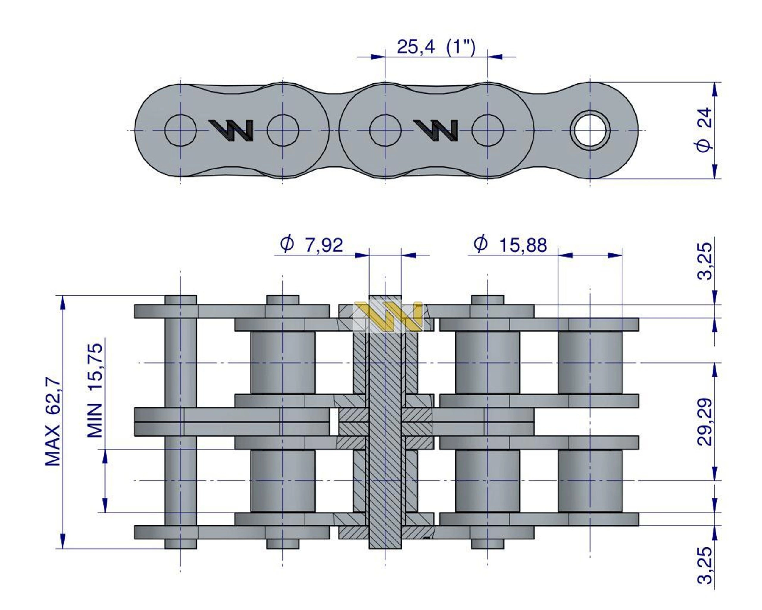 Standard Brytyjski wykonane według normy: PN77/M-84168, DIN 8187,ISO 606, BS228. Monitorowany proces hartowania sprawia, że łańcuchy firmy Waryński posiadają zwiększoną odporność na ścieranie. Proces ten odbywa się pod specjalnym nadzorem przy idealnie zachowanych parametrach pieca oraz cieczy chłodzącej. Nasze łańcuchy cechuje ponadto zwiększona wytrzymałość na rozciąganie dzięki pasowaniu sworzni z płytkami z dokładnością do mikrona oraz zwiększona odporność na zrywanie poprzez zakuwanie sworzni z odpowiednią, powtarzalną siłą. W naszych produktach idealnie zachowana jest odległość pomiędzy sworzniami, łańcuchy rolkowe Waryński perfekcyjnie współpracują z kołami zębatymi. Pamiętaj, aby stosować koła pewnych i sprawdzonych producentów. Masz dosyć rozciągających lub zrywających się łańcuchów rolkowych? Poznaj najmocniejsze ogniwo! Łańcuchy rolkowe firmy Waryński to: - zwiększona odporność na ścieranie (Hartowanie sprawia, że łańcuchy Waryński są mocniejsze i mają dłuższą żywotność. Proces ten odbywa się pod specjalnym nadzorem, dzięki czemu zapewnione są idealne paramenty pieca oraz cieczy chłodzącej.), - wytrzymałość na rozciąganie (To zasługa pasowania sworzni z płytkami, z dokładnością do mikrona. Dzięki temu łańcuch działa sprawnie – ogniwa nie wybijają się oraz nie powstają luzy. Dokładne szlifowanie elementów walcowych łańcucha zabezpiecza go przed ugniataniem i ścieraniem się elementów walcowych.), - zwiększona odporność na zrywanie (Wszystkie sworznie zakuwane z odpowiednią, powtarzalną siłą. Zbyt mocne zakucie może mieć wpływ na uszkodzenie innych elementów składowych łańcucha, zbyt słabe natomiast, może spowodować zerwanie łańcucha. Powtarzalna siła zakuwania, dzięki zautomatyzowanemu procesowi gwarantuje, że każde ogniwo łańcucha jest identyczne, perfekcyjne.), - idealna współpraca z kołami (Dokładne i powtarzalne odległości pomiędzy sworzniami powodują, że łańcuch idealnie układa się na kole, tym samym nie uszkadzając zębów koła.)
