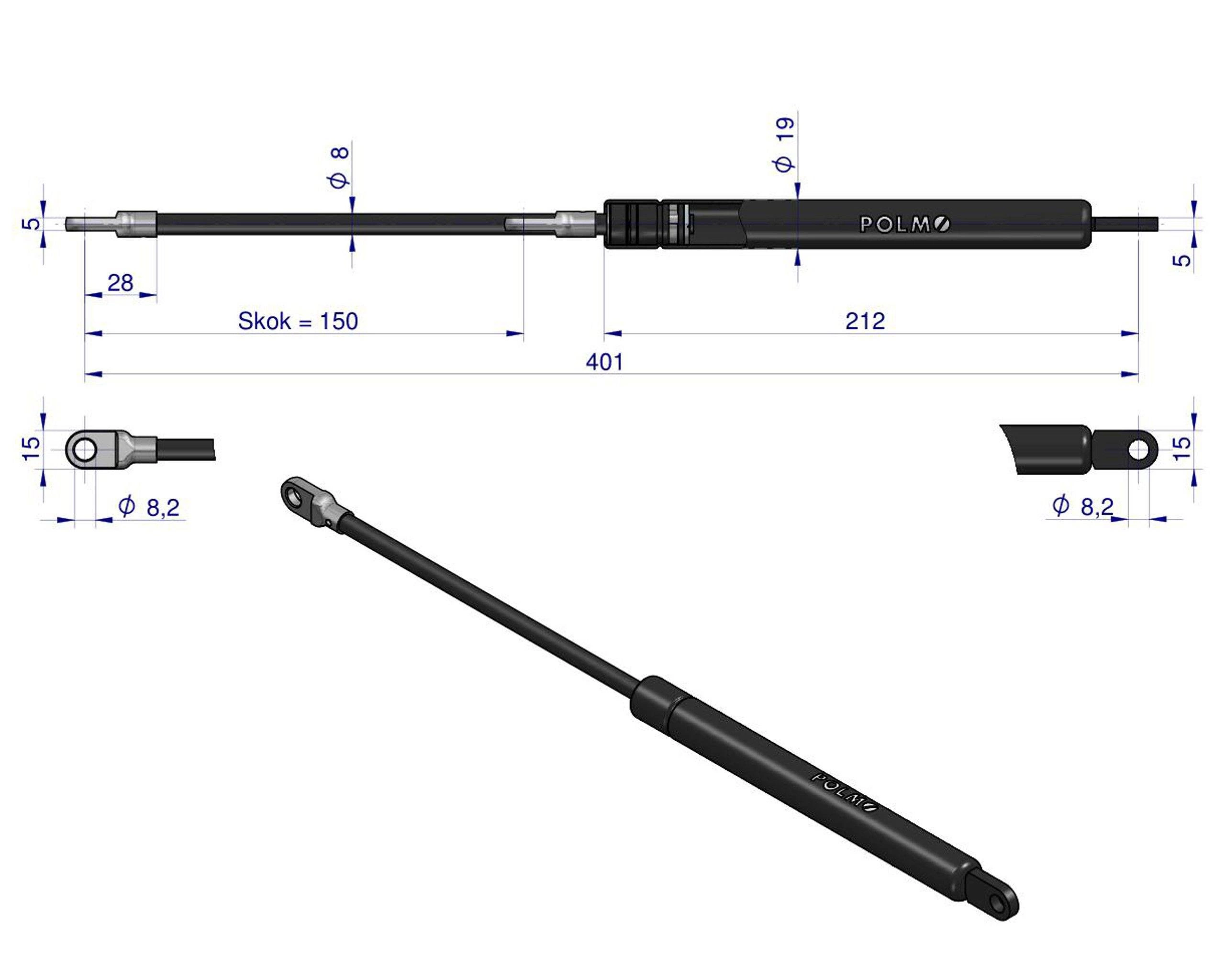 siłownik amortyzator gazowy A=400 B=205 F=250N skok 150, POLMO 1531489C1